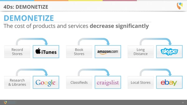 4Ds: DEMONETIZE DEMONETIZE The cost of products and services decrease significantly Record Book Long Stores Stores Distance Research Classifieds Local Stores & Libraries 11