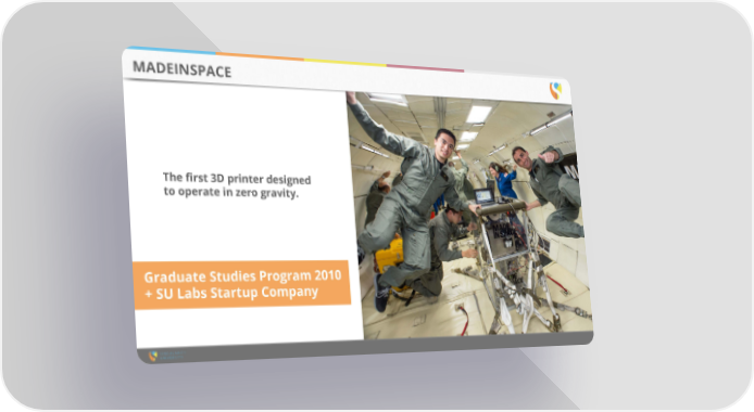 Singularity University Overview Page 17 Page 19MADEINSPACE The first 3D printer designed to operate in zero gravity. Graduate Studies Program 2010 + SU Labs Startup Company