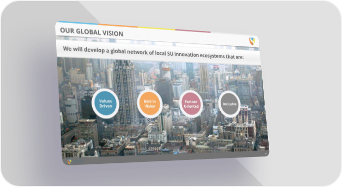 Singularity University Overview Page 23 Page 25OUR GLOBAL VISION We will develop a global network of local SU innovation ecosystems that are: Values Bold in Partner Inclusive Driven Vision Oriented 24