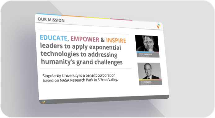 OUR MISSION EDUCATE, EMPOWER & INSPIRE leaders to apply exponential PETER DIAMANDIS technologies to addressing Co-founder of SU humanity’s grand challenges Singularity University is a benefit corporation based on NASA Research Park in Silicon Valley. RAY KURZWEIL Co-founder of SU 2