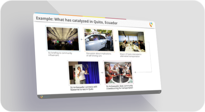 Example: What has catalyzed in Quito, Ecuador SU briefing to community Discussion about implications Mayor of Quito interested in influencers of self driving cars alternative transportation SU Ambassador connects with SU Ambassador does community Matternet to test in Quito crowdsourcing for transportation 25
